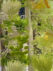大きめのガラスの容器に涼しげな色でハーバリウムに